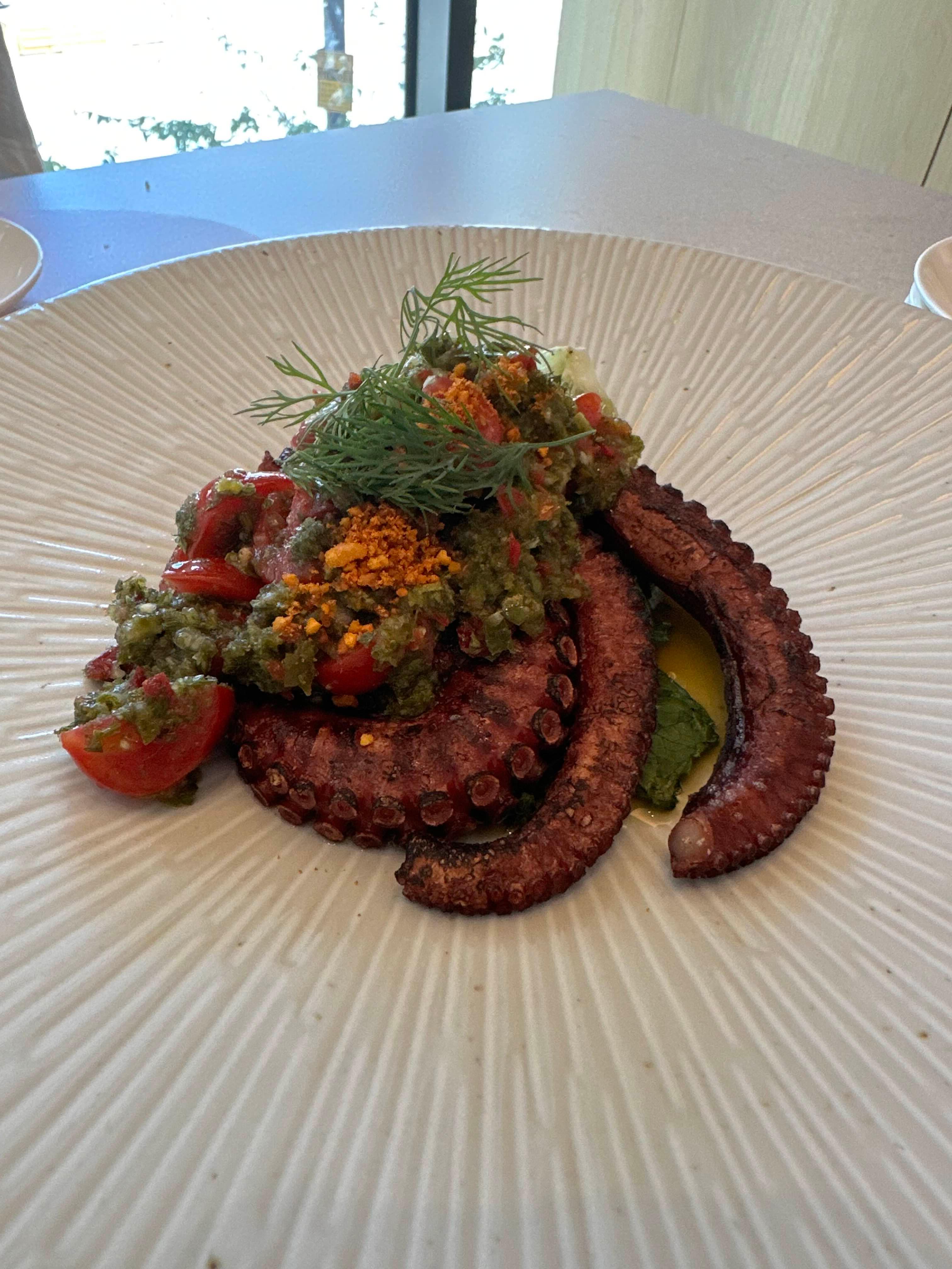 문어스테이크(방풍나물, 무지개방울토마토, 병아리콩, 로메인)