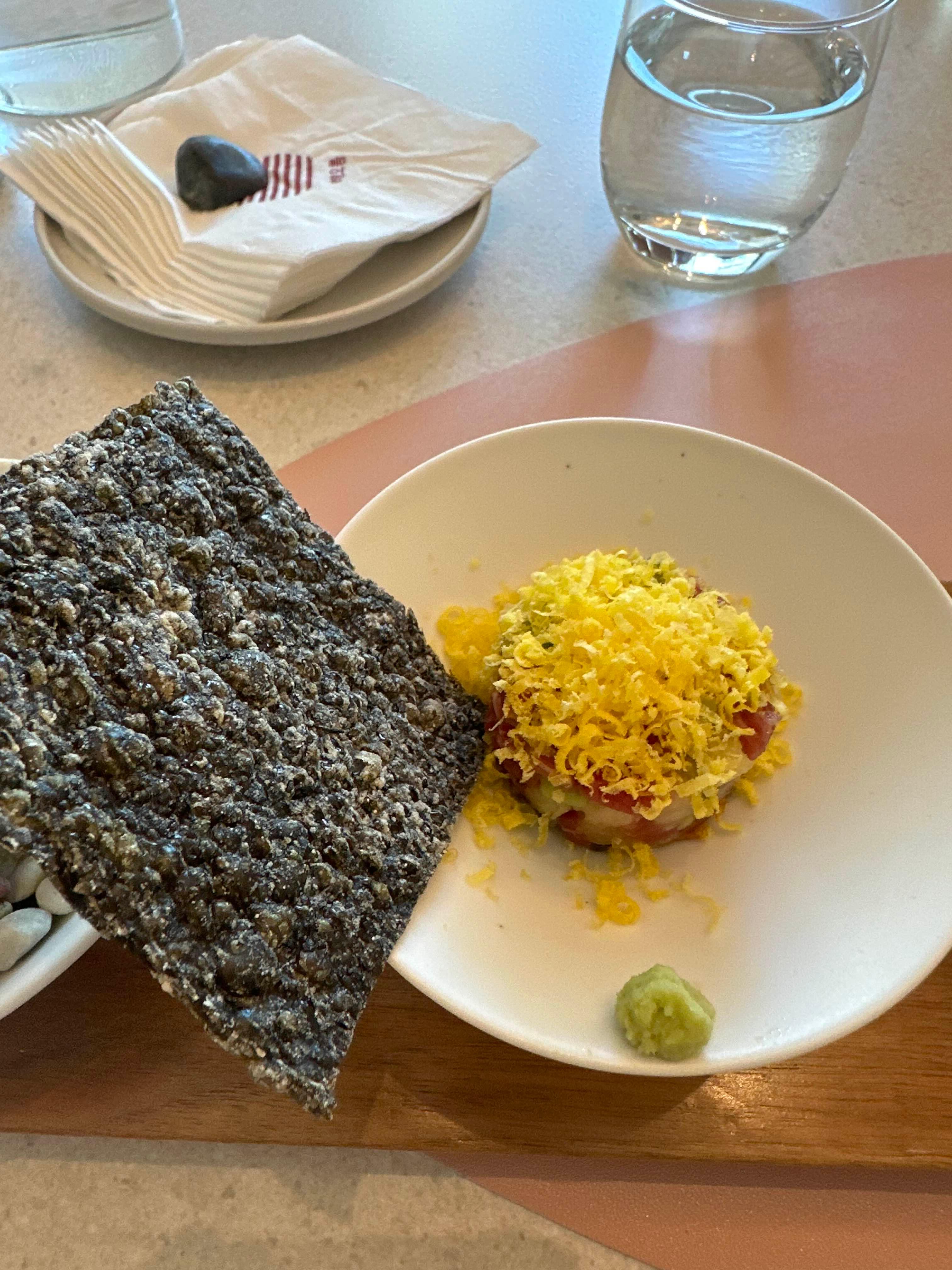 단호박 타락죽은 달지 않으면서 부드럽고 한우육회는 김부각에 올려 바삭바삭한 식감으로 재밌게 먹고