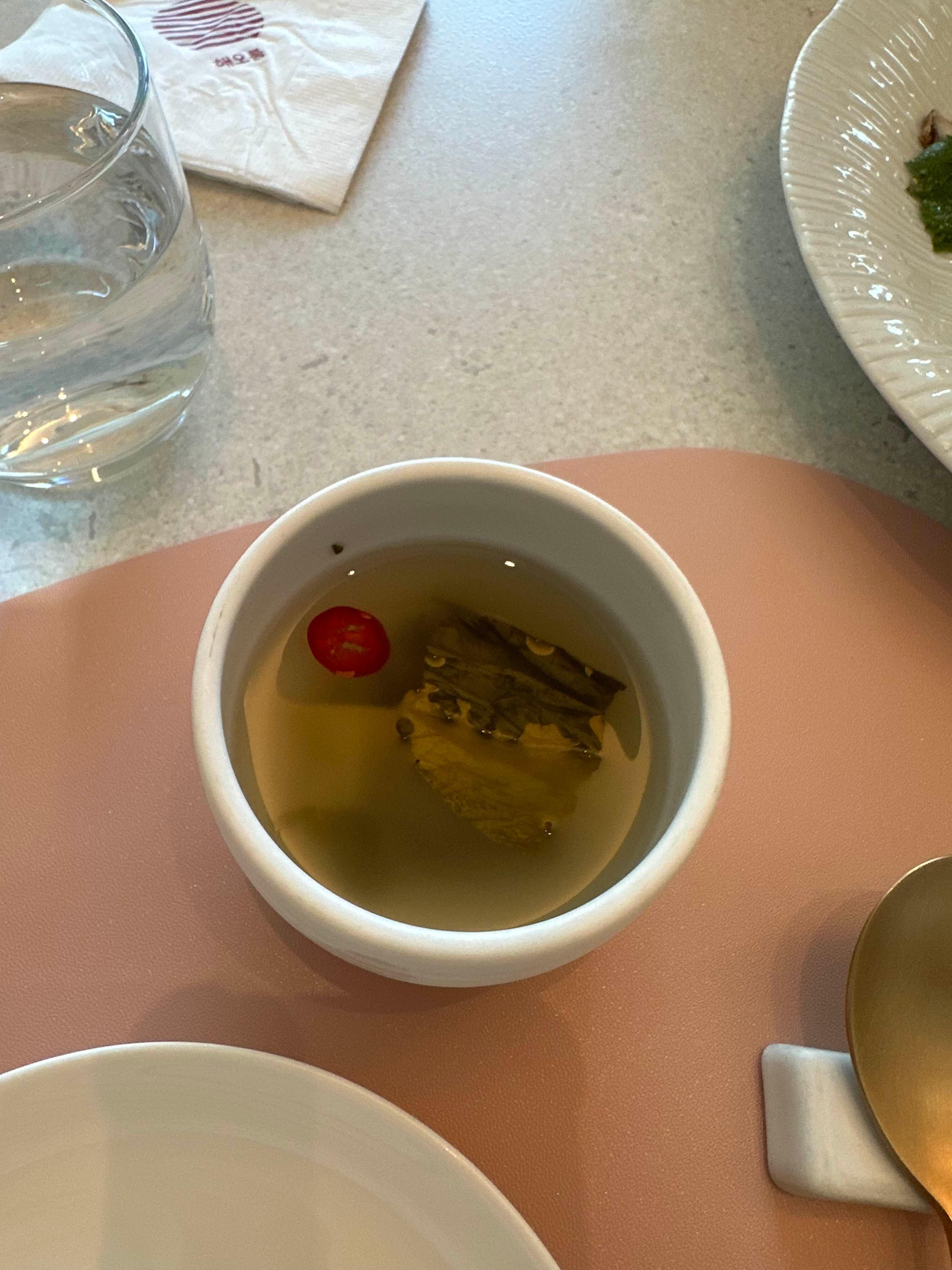 갓김치로 만든 물김치가 나왔는데요 갓의 향이 너무 좋고 동치미 같아요.